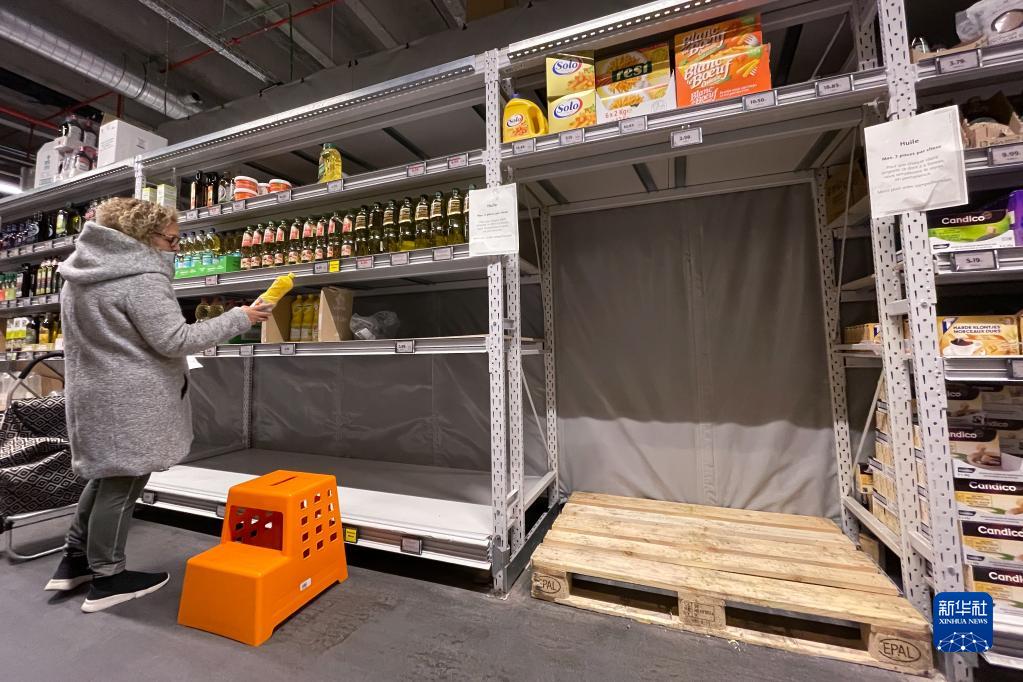 3月29日,顾客在比利时布鲁塞尔的一家超市选购食用油。该超市食用油供货紧张,每位顾客限购两件。