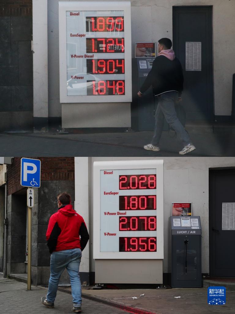 拼版照片显示,在比利时布鲁塞尔的同一个加油站,3月29日(下)的燃油价格较3月23日(上)有所上涨。