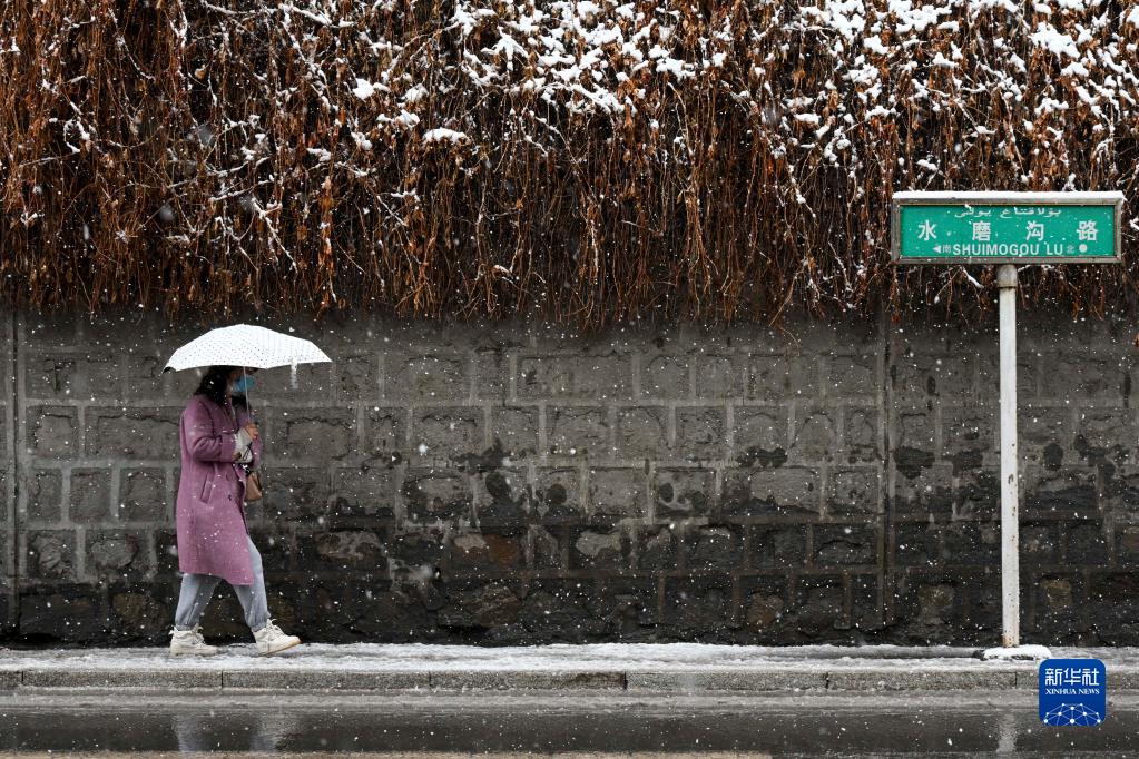 3月30日,行人在乌鲁木齐市水磨沟路冒雪行走。
