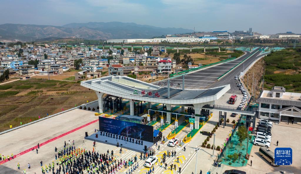 3月31日在祥云北收费站举行的云南新楚大高速公路通车仪式(无人机照片)。新华社记者 江文耀 摄