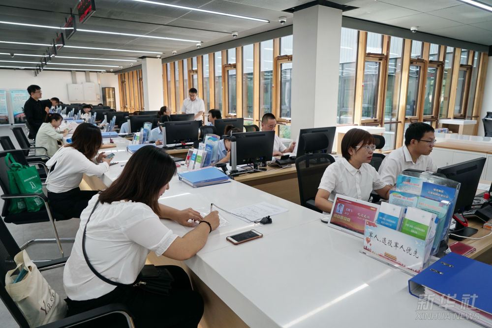 企业工作人员在中国(河北)自由贸易试验区雄安片区政务服务中心办理业务(2019年8月30日摄)。2019年8月,中国(河北)自由贸易试验区在雄安新区正式揭牌。试验区实施范围119.97平方公里,涵盖雄安片区、正定片区、曹妃甸片区、大兴机场片区四个片区。