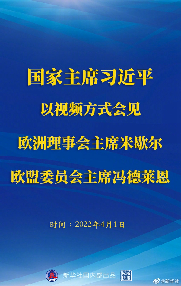 国家主席习近平4月1日晚在北京以视频方式会见欧洲理事会主席米歇尔和欧盟委员会主席冯德莱恩。