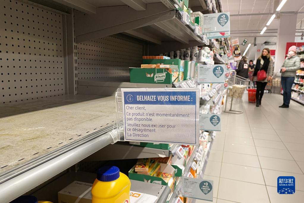 4月1日,在比利时布鲁塞尔一家超市的食用油货架上,部分商品出现短缺情况(手机照片)。