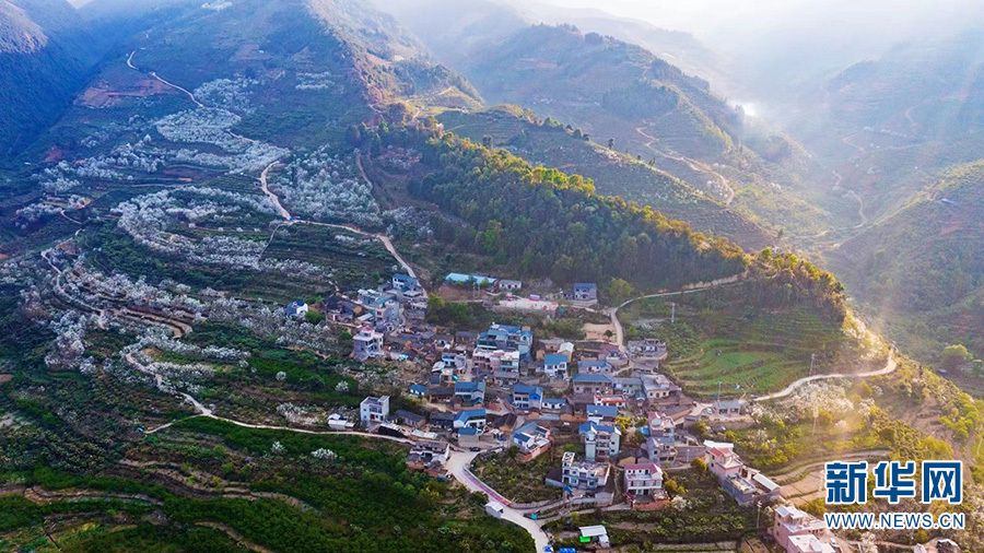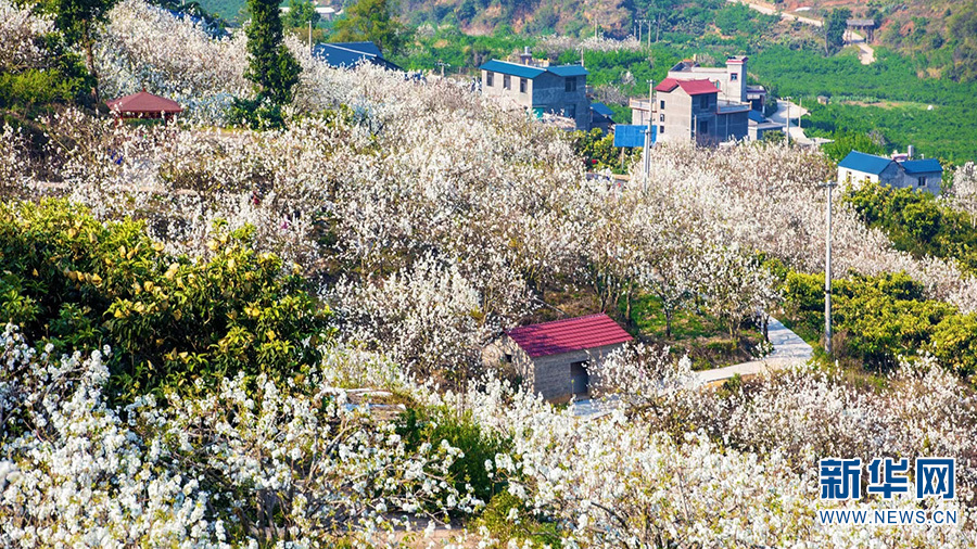近日,云南省红河哈尼族彝族自治州蒙自市新安所街道理海寨村500亩梨花绽放如雪,田园村景美如画。