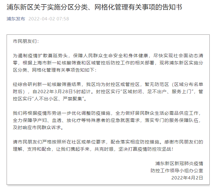 为遏制疫情扩散蔓延势头,保障人民群众生命安全和身体健康,尽快实现社会面动态清零,根据上海市新一轮核酸筛查和区域管控后防控工作的相关部署,现将浦东新区实施分区分类、网格化管理有关事项告知如下: