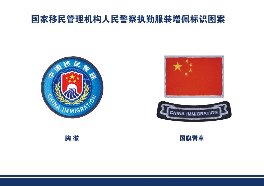 据国家移民管理局有关负责人介绍,国家移民管理机构人民警察按照《公安机关人民警察内务条令》规范着装、佩戴警衔警号等警用标志,同时根据移民管理执法执勤需要,在执勤服装上增佩中国移民管理标志胸徽和国旗臂章。中国移民管理标志胸徽位于警号正上方,国旗臂章位于执勤服装左臂位置,公安臂章位于执勤服装右臂位置。国家移民管理机构人民警察执勤服装增佩标识,有利于中外人员及时准确识别、自觉服从配合执法、方便求助服务,有利于移民管理人民警察主动接受广大人民群众监督,不断增强职业荣誉感,更好地履行法律赋予的职责任务。