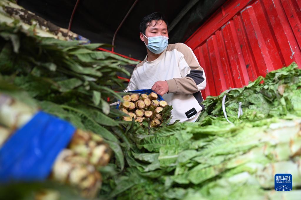 3月30日,在福建泉州晋江市禾恒蔬菜批发市场,货车司机卸下车里的蔬菜。新华社记者 周义 摄