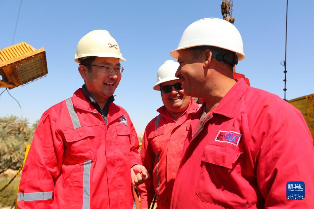 3月25日,在埃及锡瓦绿洲,中国中曼石油埃及分公司总经理李伟(左)在锡瓦深水井项目施工现场和工人交流。新华社记者 隋先凯 摄