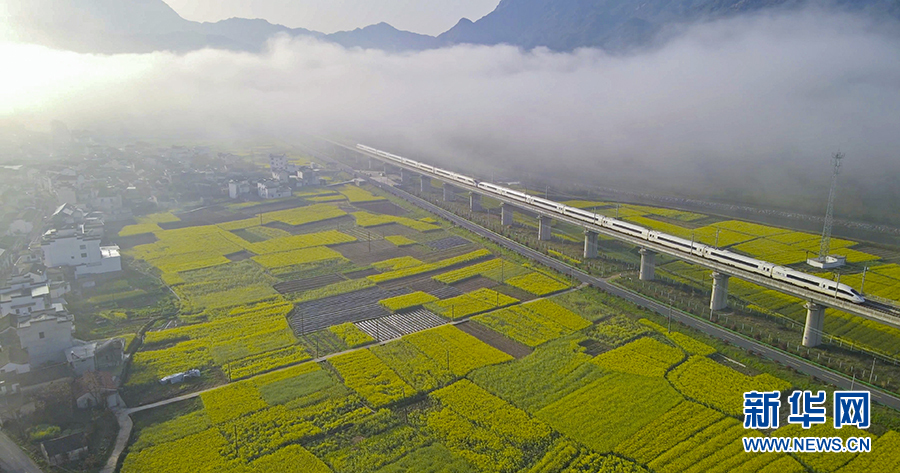 安徽省宣城市绩溪县伏岭,飞驰的列车穿过盛开的油菜花田(3月30日摄)。