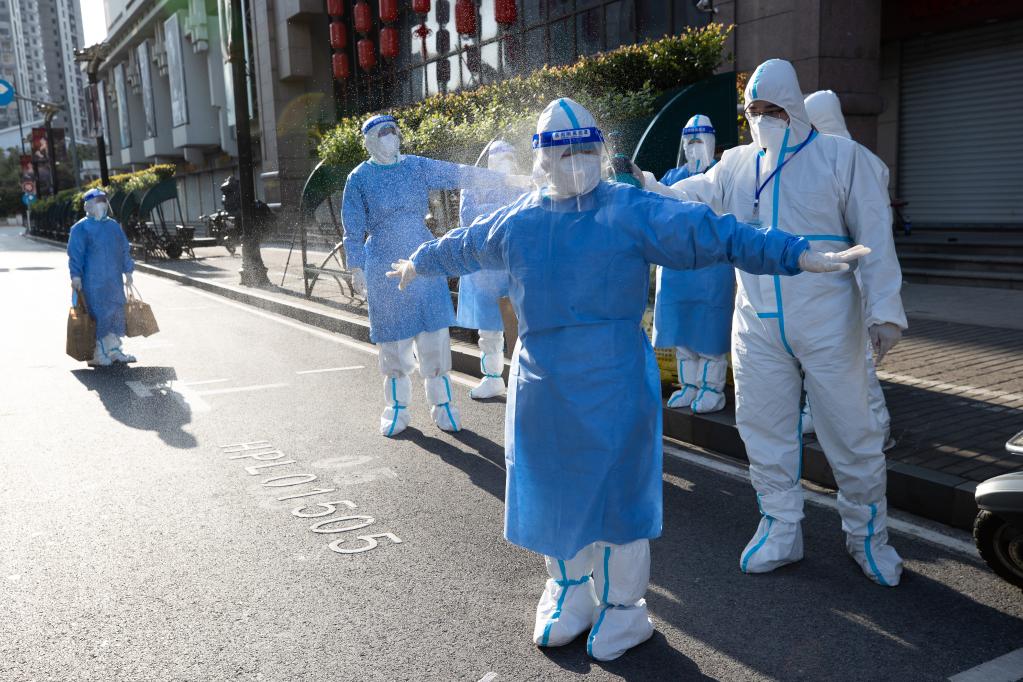 一名志愿者正在楼下做消杀。新华社记者 金立旺 摄