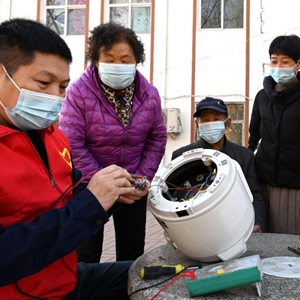 2022年3月5日,在河北省邯郸市丛台区光明桥街道电厂社区,志愿者在“学雷锋、树新风”志愿服务活动上为居民免费维修小家电。(新华社发)