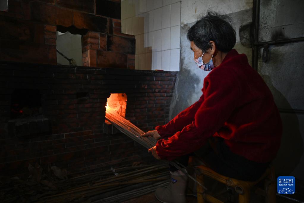 4月5日,在泉州市浮桥街道新步社区,一位“爱心厨房”的志愿者奶奶在烧柴生火。