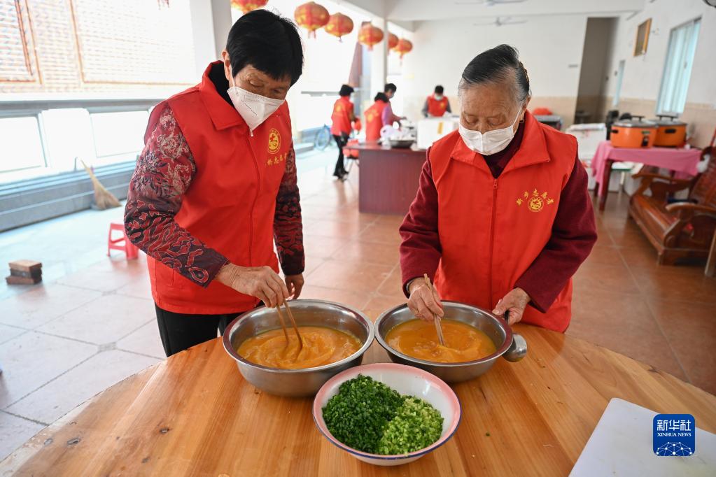4月5日,在泉州市浮桥街道新步社区,“爱心厨房”的志愿者奶奶们在搅拌鸡蛋。