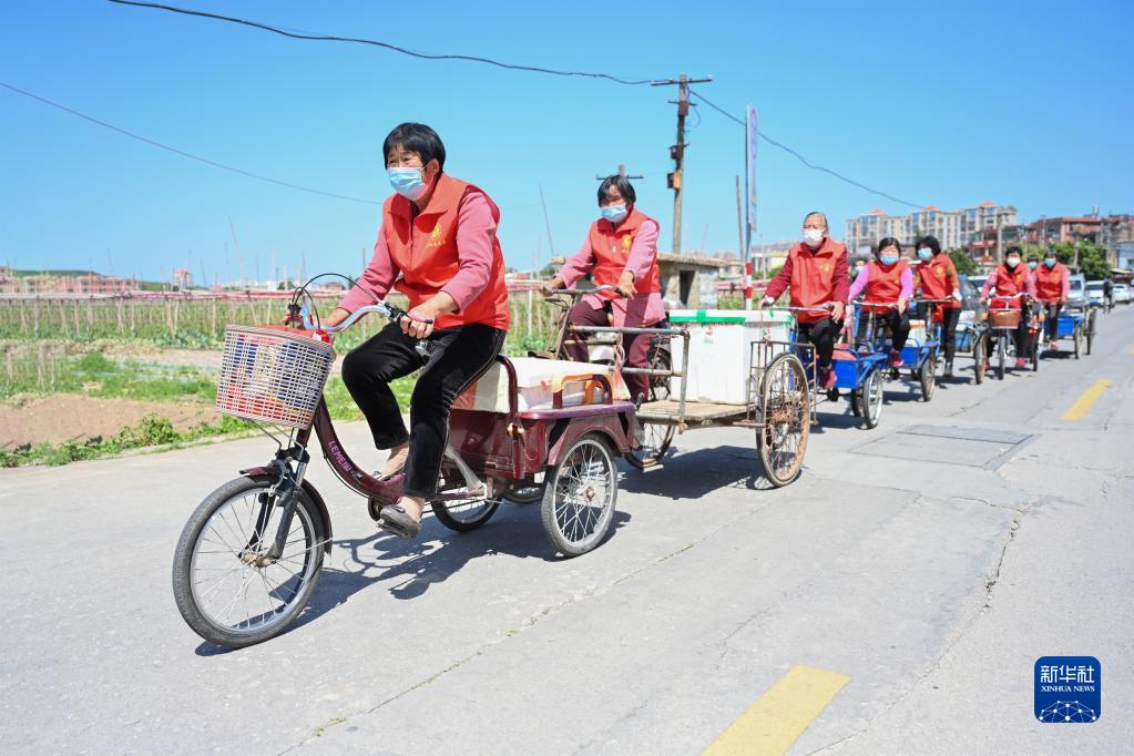 4月5日,在泉州市浮桥街道新步社区,“爱心厨房”的志愿者奶奶们骑三轮车配送午餐。
