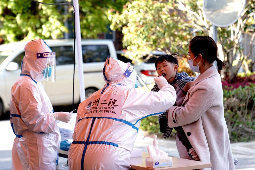 4月4日,在上海松江区祥欣居民区,浙江援沪医疗队队员为小朋友进行核酸检测采样。新华社记者 张建松 摄