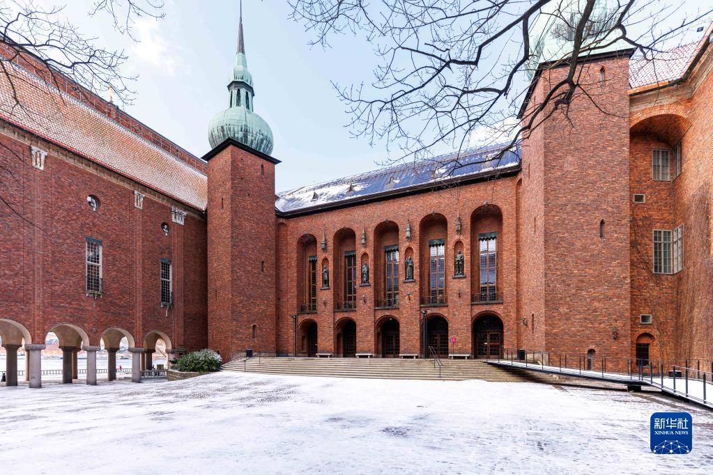 这是4月5日在瑞典首都斯德哥尔摩市政厅庭院内拍摄的雪景。