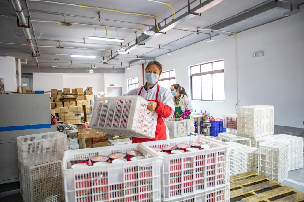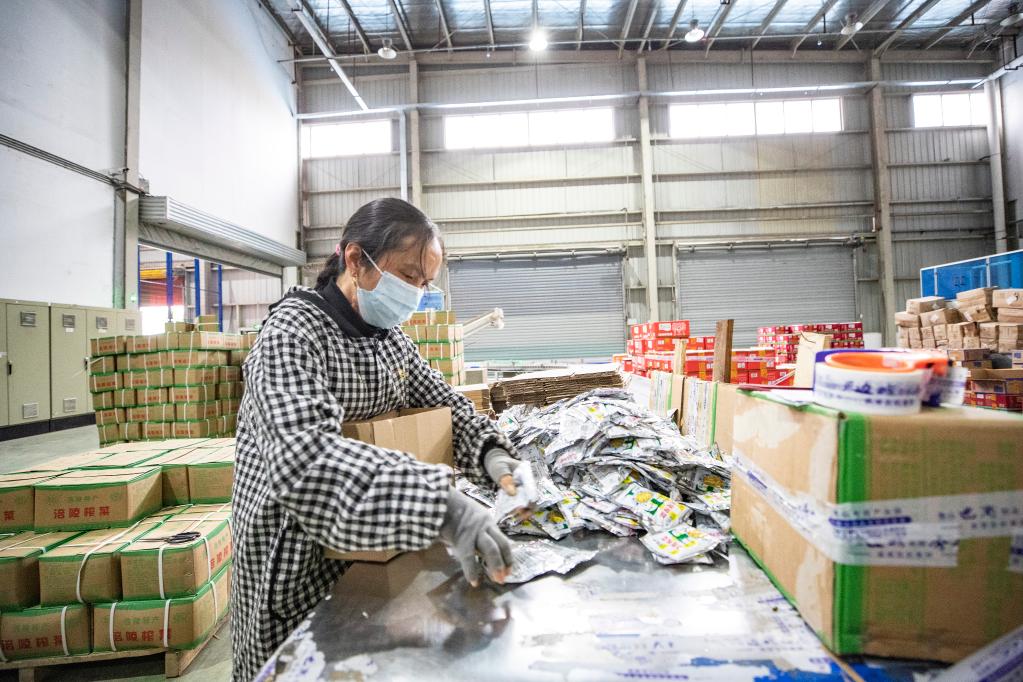 3月24日,在重庆市秀山土家族苗族自治县现代物流园内,一家企业的员工在搬运包装好的方便食品。 新华社记者黄伟 摄