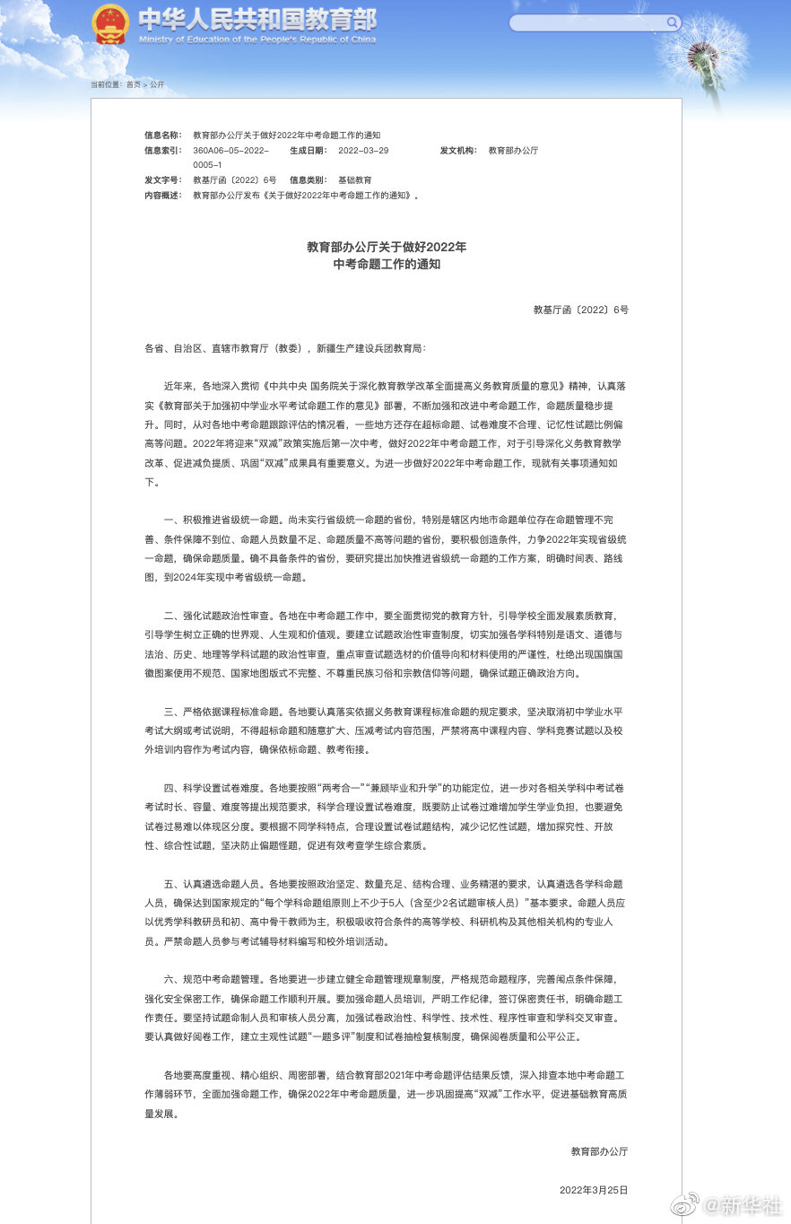 记者6日从教育部网站获悉,教育部办公厅日前发布《关于做好2022年中考命题工作的通知》,要求各地要认真落实依据义务教育课程标准命题的规定要求,不得超标命题和随意扩大、压减考试内容范围,严禁将高中课程内容、学科竞赛试题以及校外培训内容作为考试内容。同时要求积极推进省级统一命题、强化试题政治性审查、科学设置试卷难度、认真遴选命题人员、规范中考命题管理等。(记者王鹏)