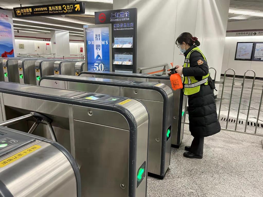 4月5日工作人员在给高科西路站进行消杀。(上海地铁供图)
