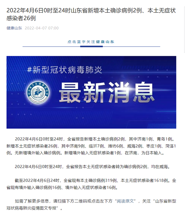 2022年4月6日0时至24时,全省报告新增本土确诊病例2例,其中济南1例、青岛1例。新增本土无症状感染者26例,其中济南9例、临沂7例、潍坊6例、威海2例、枣庄1例、菏泽1例。无新增境外输入确诊病例。新增境外输入无症状感染者1例,在济南,为日本输入。