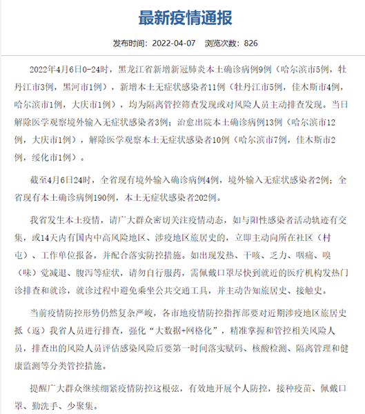 2022年4月6日0-24时,黑龙江省新增新冠肺炎本土确诊病例9例(哈尔滨市5例,牡丹江市3例,黑河市1例),新增本土无症状感染者11例(牡丹江市5例,佳木斯市4例,哈尔滨市1例,大庆市1例),均为隔离管控筛查发现或对风险人员主动排查发现。当日解除医学观察境外输入无症状感染者3例;治愈出院本土确诊病例13例(哈尔滨市12例,大庆市1例),解除医学观察本土无症状感染者10例(哈尔滨市7例,佳木斯市2例,绥化市1例)。