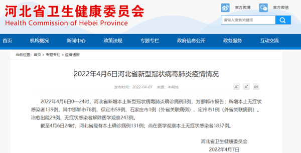 2022年4月6日0—24时,河北省新增本土新型冠状病毒肺炎确诊病例3例,为邯郸市报告;新增本土无症状感染者139例,其中邯郸市78例、保定市59例、石家庄市1例(外省关联病例)、定州市1例(外省关联病例)。治愈出院29例,无症状感染者解除医学观察243例。