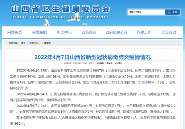 2022年4月6日0-24时,山西省新增本土新冠肺炎确诊病例7例(太原市小店区6例、运城市临猗县1例)。累计报告确诊病例197例,治愈出院168例。现有在院隔离治疗病例29例(太原市小店区16例、太原市晋源区1例、太原市万柏林区1例、晋中市榆次区1例、运城市临猗县3例、临汾市洪洞县1例、大同市浑源县1例、忻州市原平市5例)。现有疑似病例0例。