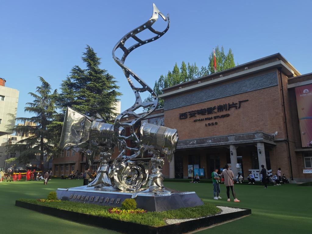 距离西安市地标大雁塔不远处,有一片影视爱好者的乐土:20世纪的置景车间坐落在枝干遒劲的梧桐树旁,老电影巨幅海报张贴在古朴的红砖墙上,放映机、胶片和镜头组成的大型雕塑在落日余晖中更显年代感。