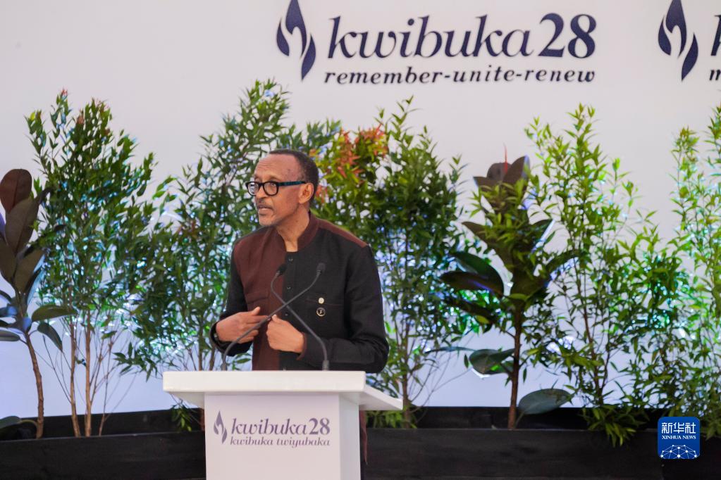 4月7日,卢旺达总统卡加梅在基加利举行的大屠杀28周年纪念活动上发表讲话。新华社发(西里尔·恩德格亚摄)