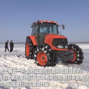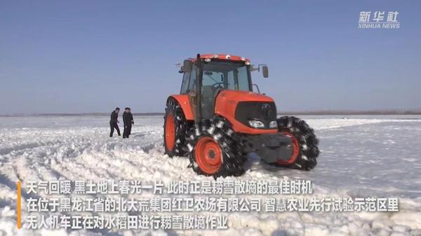 随着天气转暖,沉寂了一冬的黑土地上又开始了新一年的忙碌。在位于黑龙江省的北大荒集团红卫农场有限公司智慧农业先行试验示范区里,无人机车正在水稻田里进行耢雪散墒作业。