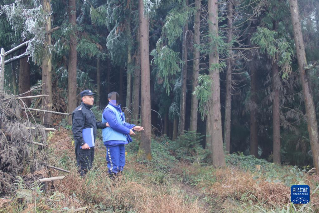 “12·3”案办案民警带涉嫌盗猎的犯罪嫌疑人辨认盗猎现场(2021年1月13日摄)。新华社发(雅安市公安局供图)