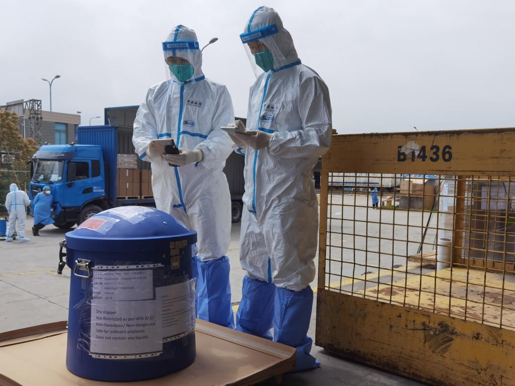 图为浦东国际机场海关关员对进口血液制品进行查验。(3月29日摄,上海海关提供)