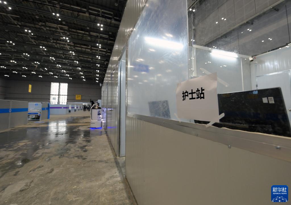 4月9日,完工交付的“四叶草”方舱医院3号馆内即将投入使用的护士站。新华社记者 李贺 摄