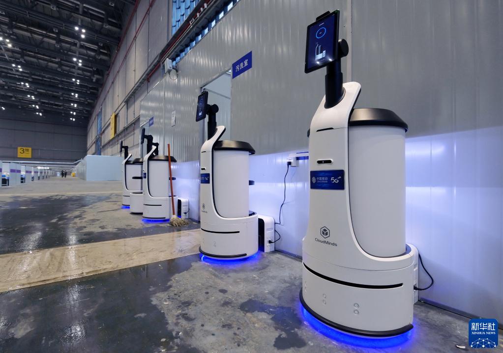 4月9日,在完工交付的“四叶草”方舱医院3号馆内,云端智能服务机器人已经就位,即将为收治在这里的病患提供多种服务。新华社记者 李贺 摄