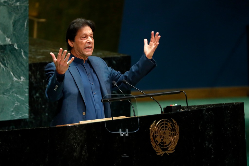 2019年9月27日,在位于纽约的联合国总部,巴基斯坦总理伊姆兰·汗在第74届联合国大会一般性辩论上发言。新华社记者李木子摄