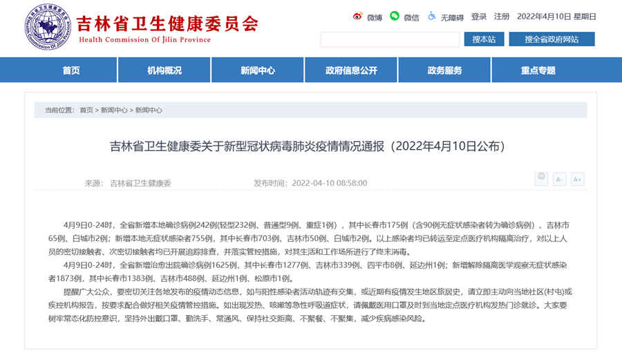 4月9日0-24时,全省新增本地确诊病例242例(轻型232例、普通型9例、重症1例),其中长春市175例(含90例无症状感染者转为确诊病例)、吉林市65例、白城市2例;新增本地无症状感染者755例,其中长春市703例、吉林市50例、白城市2例。以上感染者均已转运至定点医疗机构隔离治疗,对以上人员的密切接触者、次密切接触者均已开展追踪排查,并落实管控措施,对其生活和工作场所进行了终末消毒。