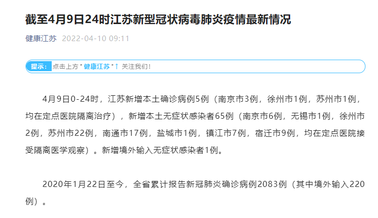 4月9日0-24时,江苏新增本土确诊病例5例(南京市3例,徐州市1例,苏州市1例,均在定点医院隔离治疗),新增本土无症状感染者65例(南京市6例,无锡市1例,徐州市2例,苏州市22例,南通市17例,盐城市1例,镇江市7例,宿迁市9例,均在定点医院接受隔离医学观察)。新增境外输入无症状感染者1例。