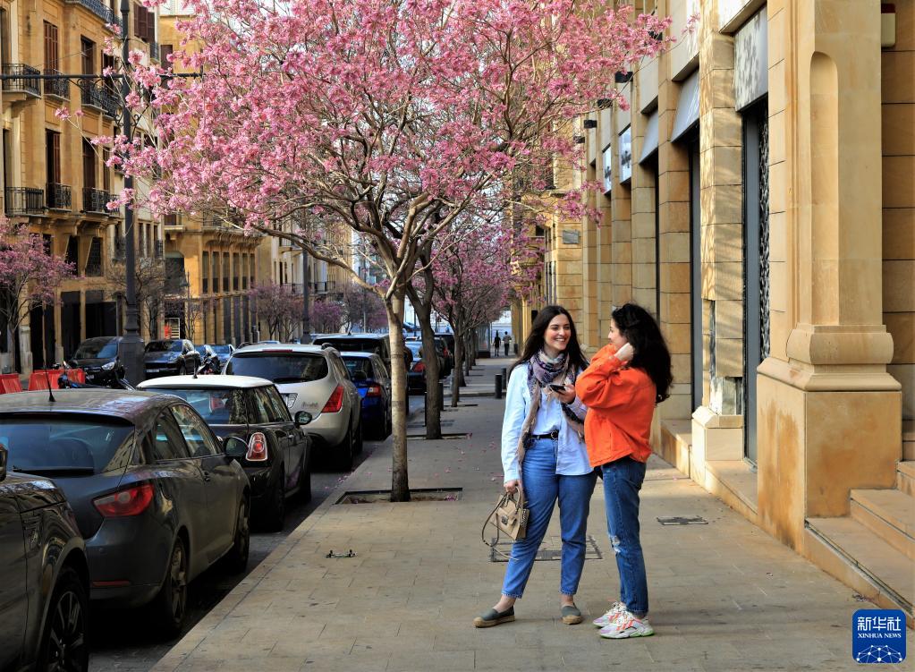 近日,黎巴嫩首都贝鲁特闹市区商业街两旁的风铃木花盛开,繁花似锦。