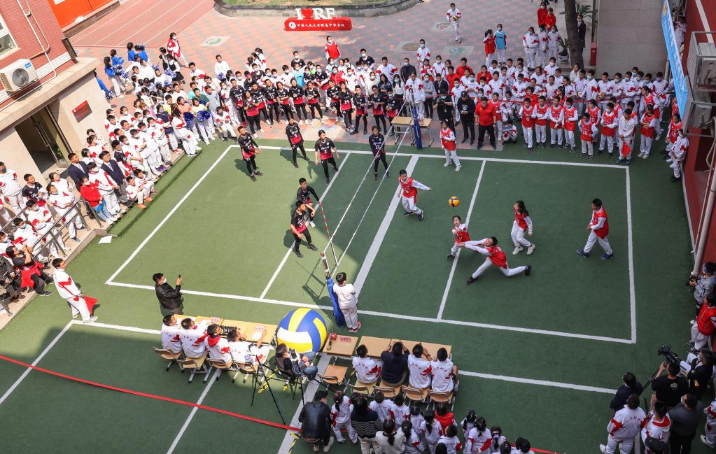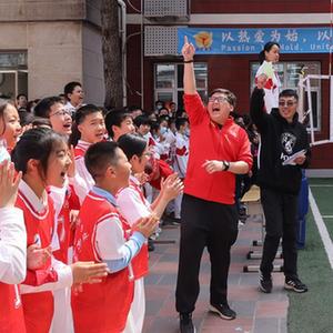 “ACE!ACE!ACE!六班加油!”4月8日中午,位于北京海淀区的中国人民大学附属中学分校热闹非凡,三面临着教学楼的迷你排球场边挤满了观战的同学,楼上的教室窗口成了视角绝佳的“包厢”。正在举行的是“团结杯”初一年级排球·啦啦操联赛的决赛,对战双方是7班和6班。数学老师李晨光和3名同学组成现场解说团,比赛的画面还通过网络直播传到了无法现场观战的家长面前。