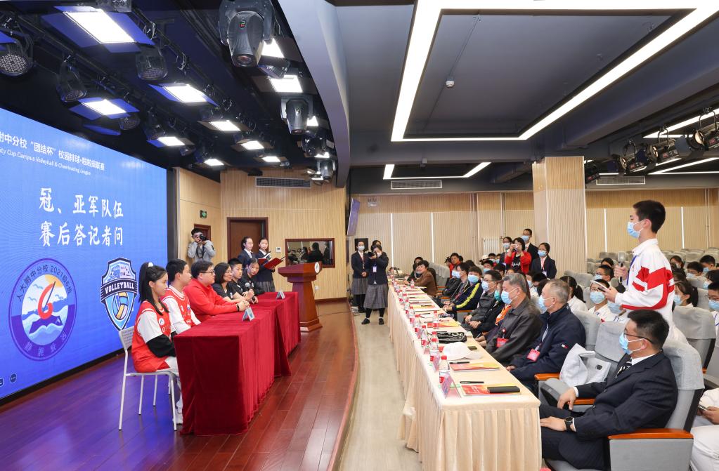 在赛后的冠、亚军新闻发布会上,两位同学担任双语主持,校园小记者们向两队的6位代表轮番提问。李金泽说:“虽然我们输了,但发挥出了最好的水平,展现出了青春风采。”听着这有板有眼的回答,现场观摩的雅典奥运会女排冠军杨昊露出了微笑。