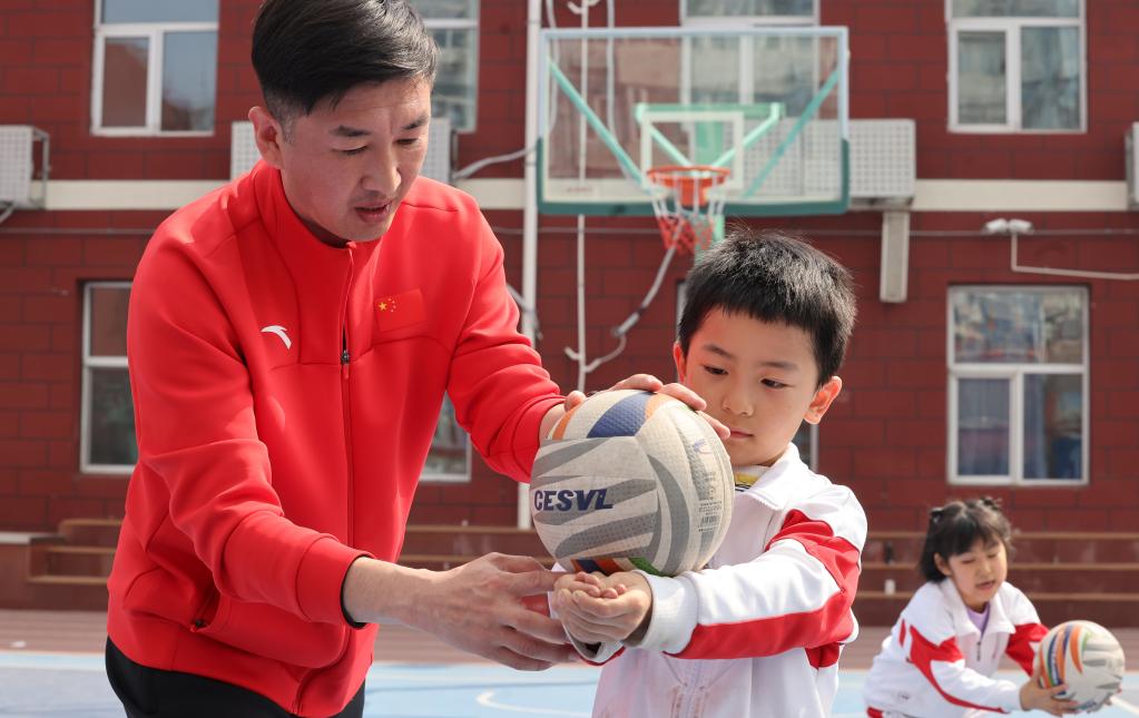 4月8日,中国人民大学附属中学分校体育老师祁宏鹰(左)在指导小学部的学生练习排球。新华社记者殷刚摄
