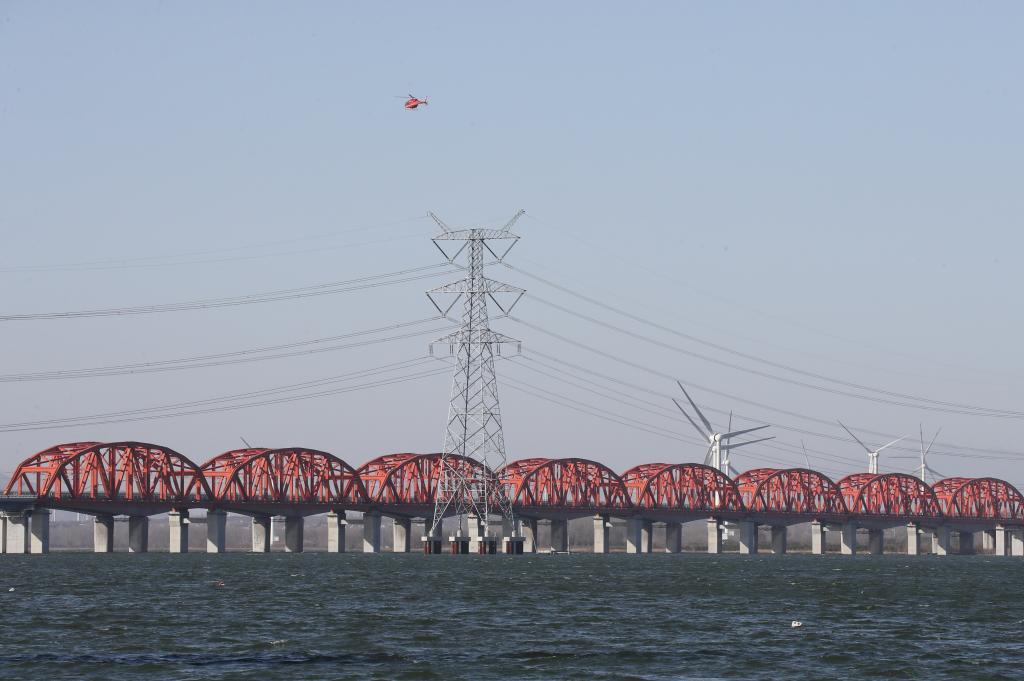 2021年11月12日,国网冀北电力公司联合国网通航公司在河北省怀来县官厅水库对涉奥重要输电线路——500千伏张北柔直工程中都送延庆线路进行了直升机带电处缺,确保线路安全稳定运行,全力保证北京2022年冬奥会低碳绿电持续稳定供应。新华社记者杨世尧摄