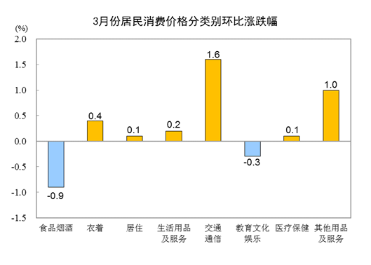 3月份,食品烟酒类价格环比下降0.9%,影响CPI下降约0.26个百分点。食品中,畜肉类价格下降4.9%,影响CPI下降约0.15个百分点,其中猪肉价格下降9.3%,影响CPI下降约0.12个百分点;鲜果价格下降2.3%,影响CPI下降约0.05个百分点;水产品价格下降2.1%,影响CPI下降约0.04个百分点;粮食价格上涨0.5%,影响CPI上涨约0.01个百分点;鲜菜价格上涨0.4%,影响CPI上涨约0.01个百分点。