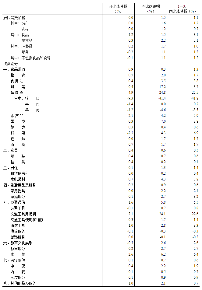 3月份,全国居民消费价格环比持平。其中,城市持平,农村持平;食品价格下降1.2%,非食品价格上涨0.3%;消费品价格上涨0.2%,服务价格下降0.2%。