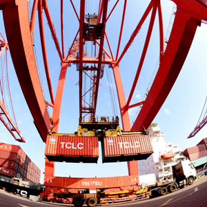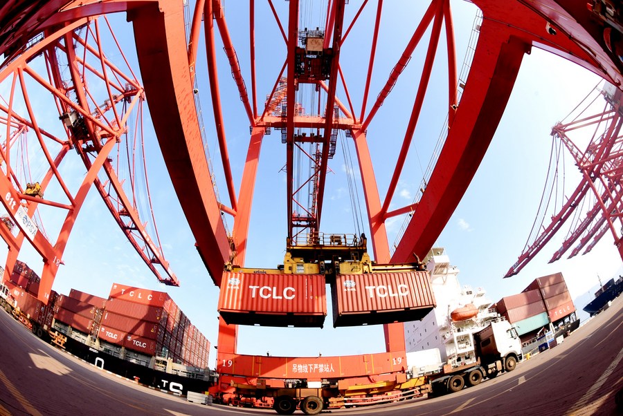 2021年12月7日,在江苏连云港港口码头,货轮进行集装箱装卸作业。(新华社发,耿玉和摄)