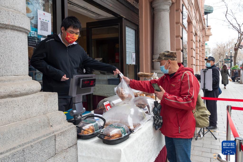 4月11日,市民在哈尔滨市中央大街一商店购买食品。