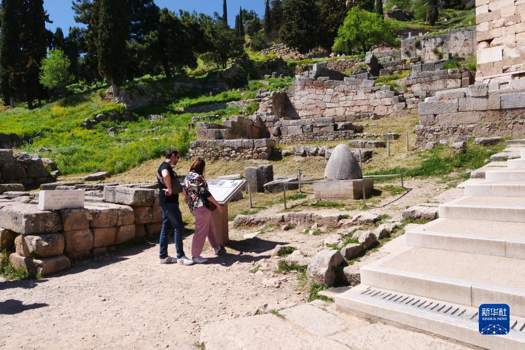 4月8日,在希腊中部德尔斐地区,游客在德尔斐考古遗址游览。