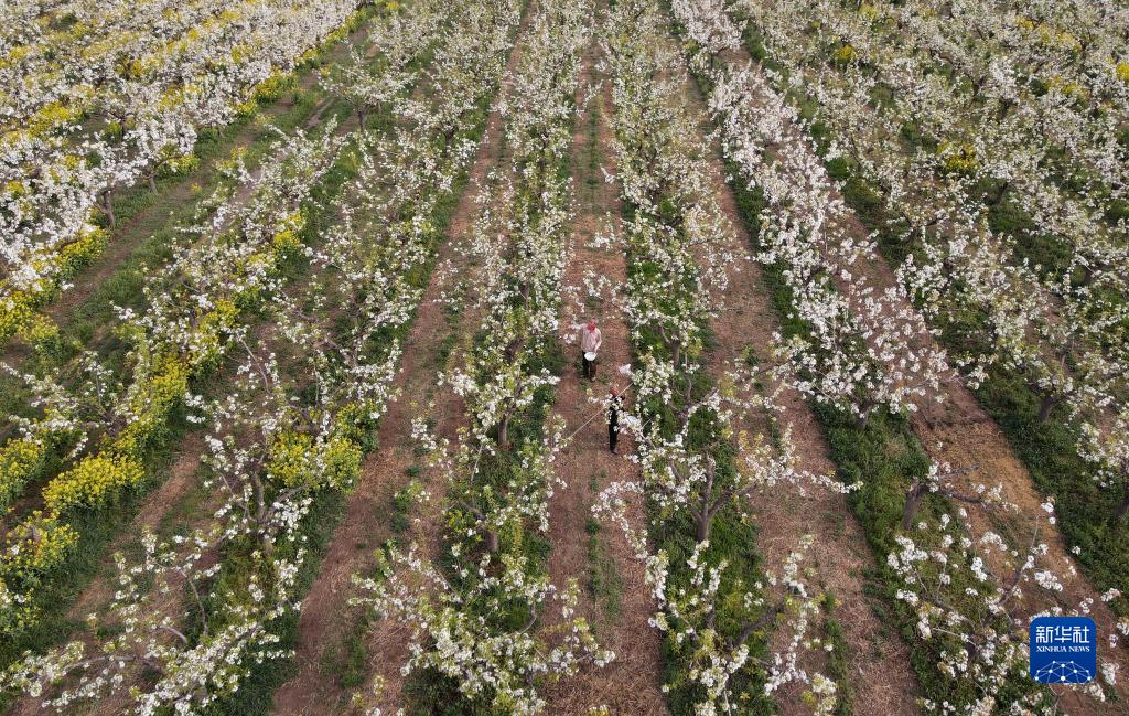 4月12日,河北省石家庄市深泽县大桥头镇农民为梨花授粉(无人机照片)。