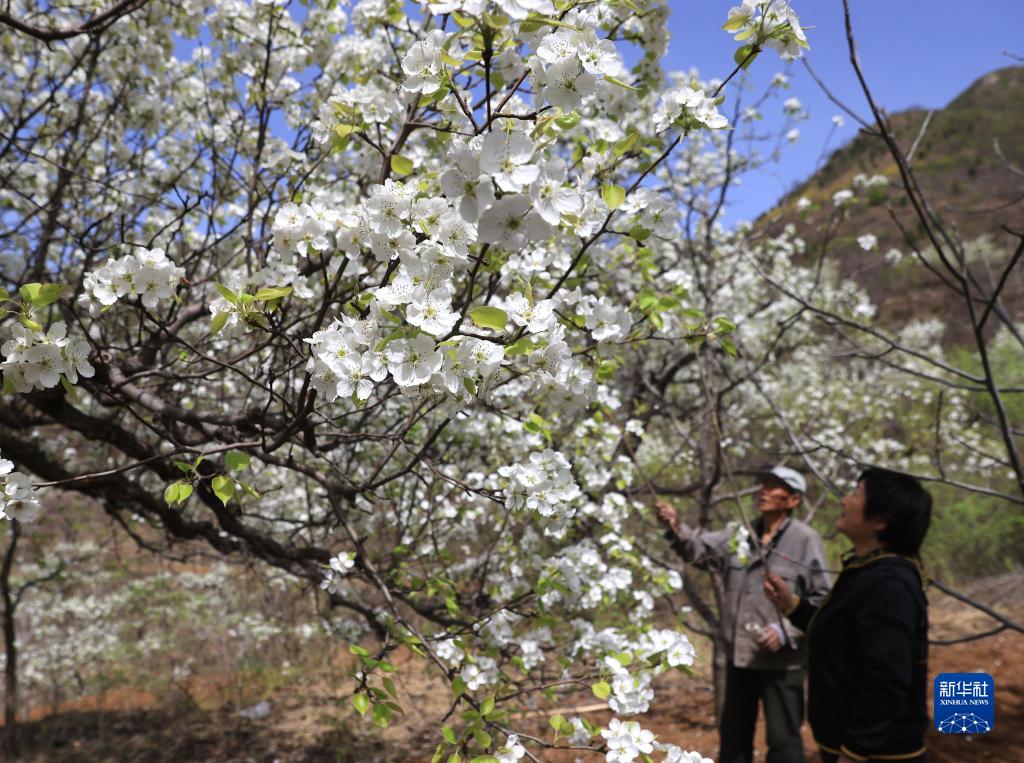 4月12日,河北省唐山市迁西县新庄子镇常甸村农民在给梨花授粉。