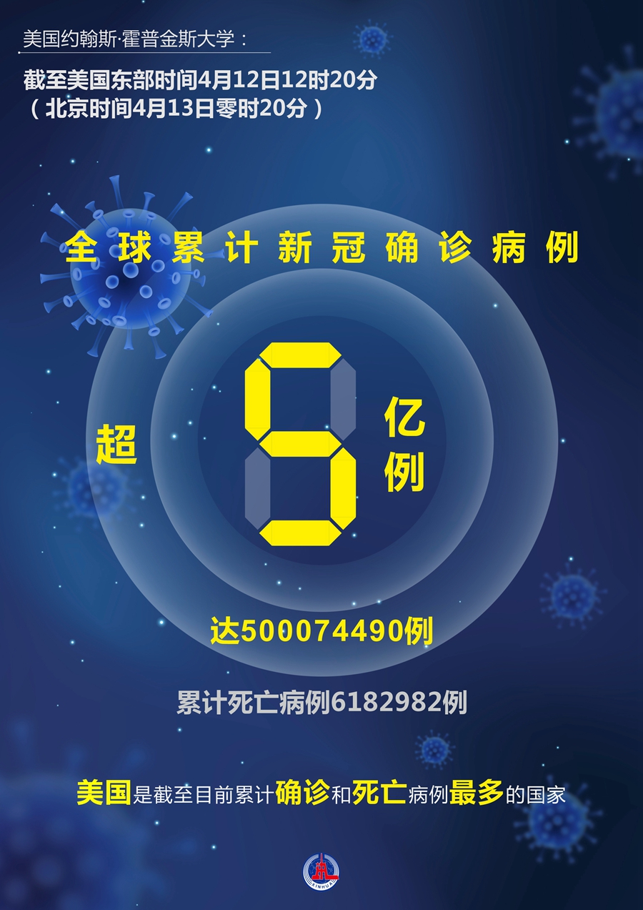 新华社纽约4月12日电 美国约翰斯·霍普金斯大学12日发布的新冠疫情最新统计数据显示,截至美国东部时间12日12时20分(北京时间13日零时20分),全球累计新冠确诊病例超过5亿例,达500074490例,累计死亡病例6182982例。